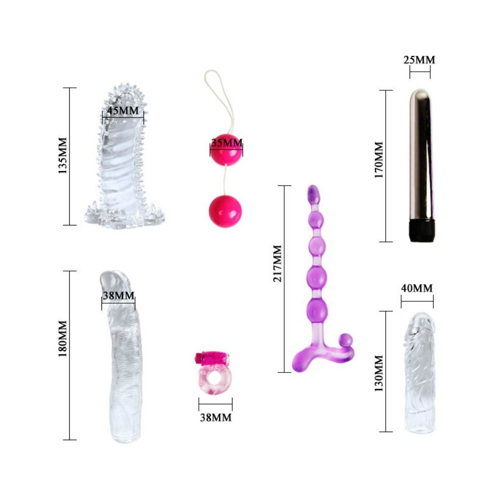 Součástí balení je vibrační stimulátor s více rychlostmi a nástavci, realistické dildo, texturovaný kroužek a další doplňky, které zpestří každý intimní moment. Různorodé tvary a struktury přinášejí nové vjemy a umožňují kombinovat různé druhy stimulace podle nálady.